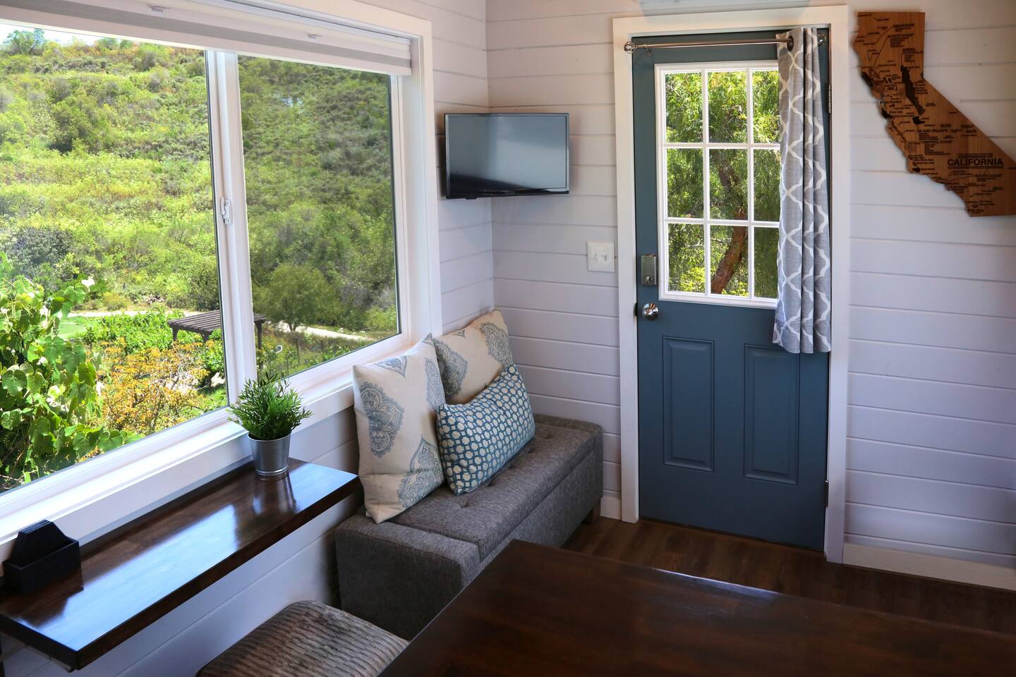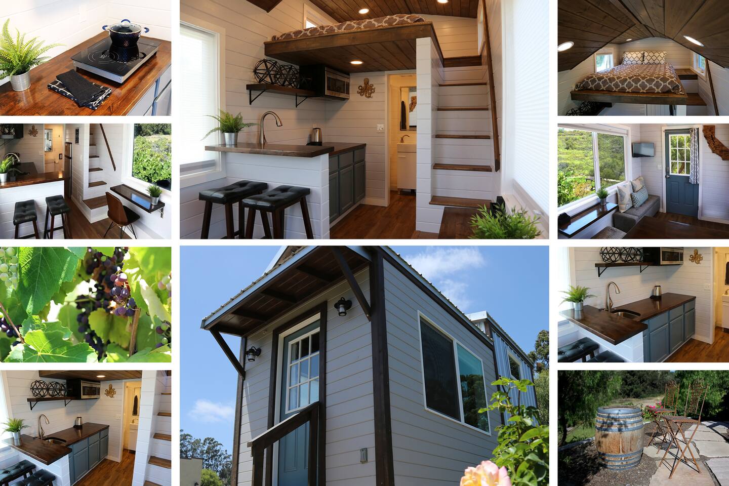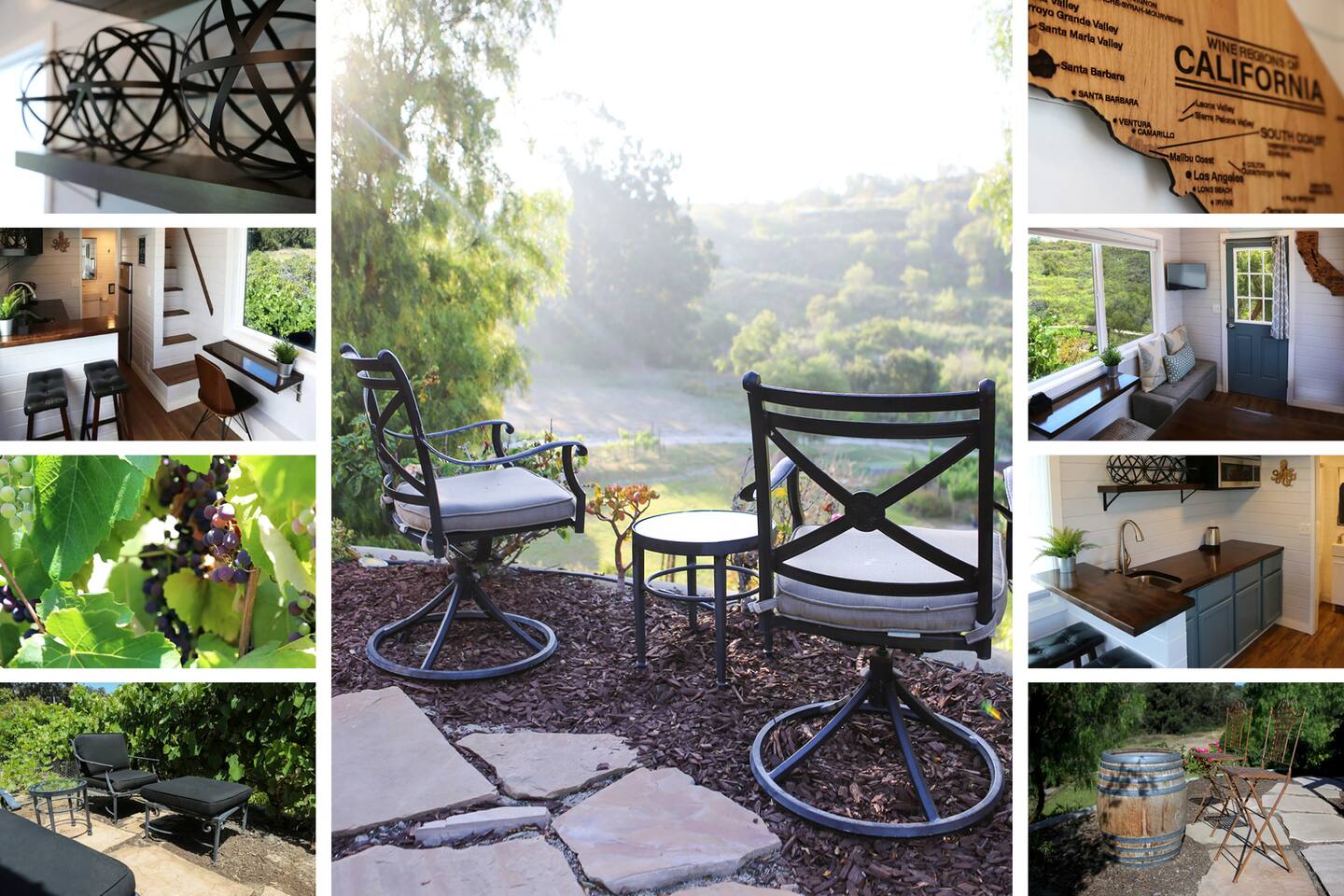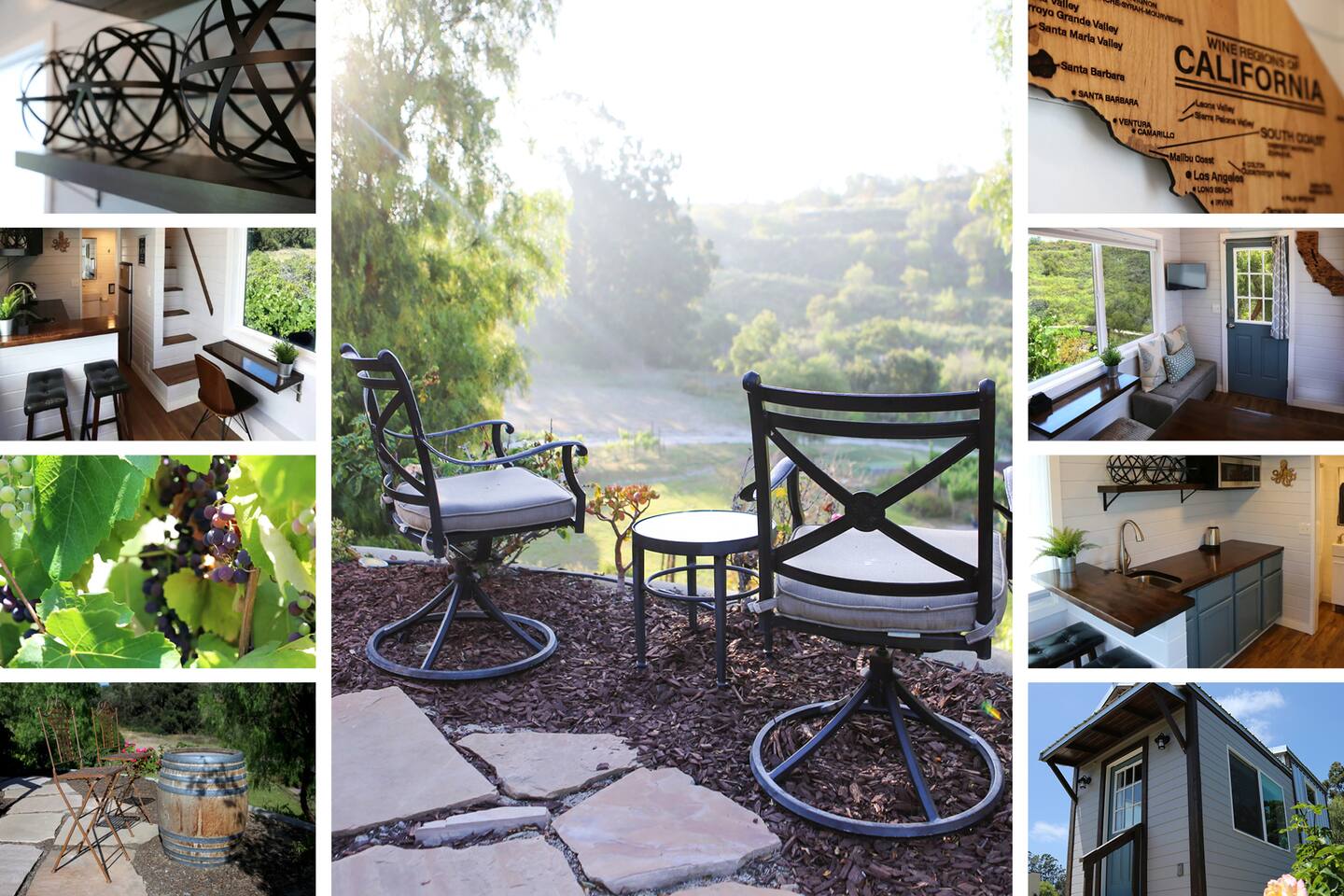 The Vista, "in a tiny experience." Enjoy a relaxing stay in a tranquil location with a nice view above the 200 vine vineyard. Listen to the sounds of birds. Includes a full kitchen, bathroom, queen bed located in the loft (you must go up narrow steep steps,) convection oven/microwave, induction range, air conditioner, heater, desk, indoor and outdoor shower, and quaint patio. Very fast WIFI. The home has both an indoor and outdoor shower.