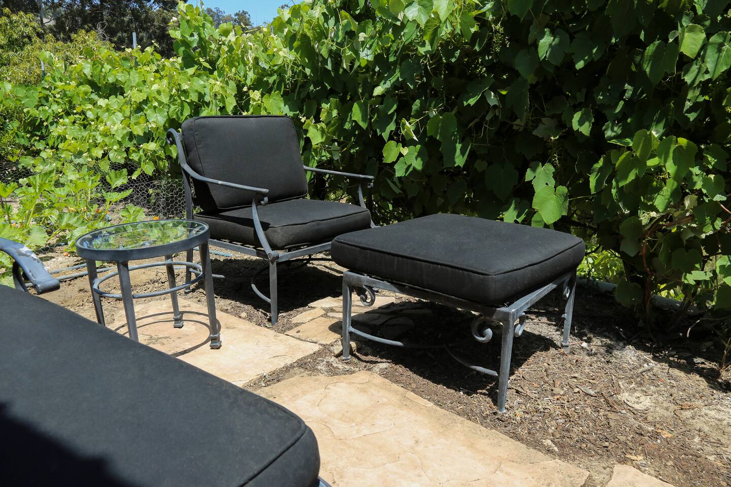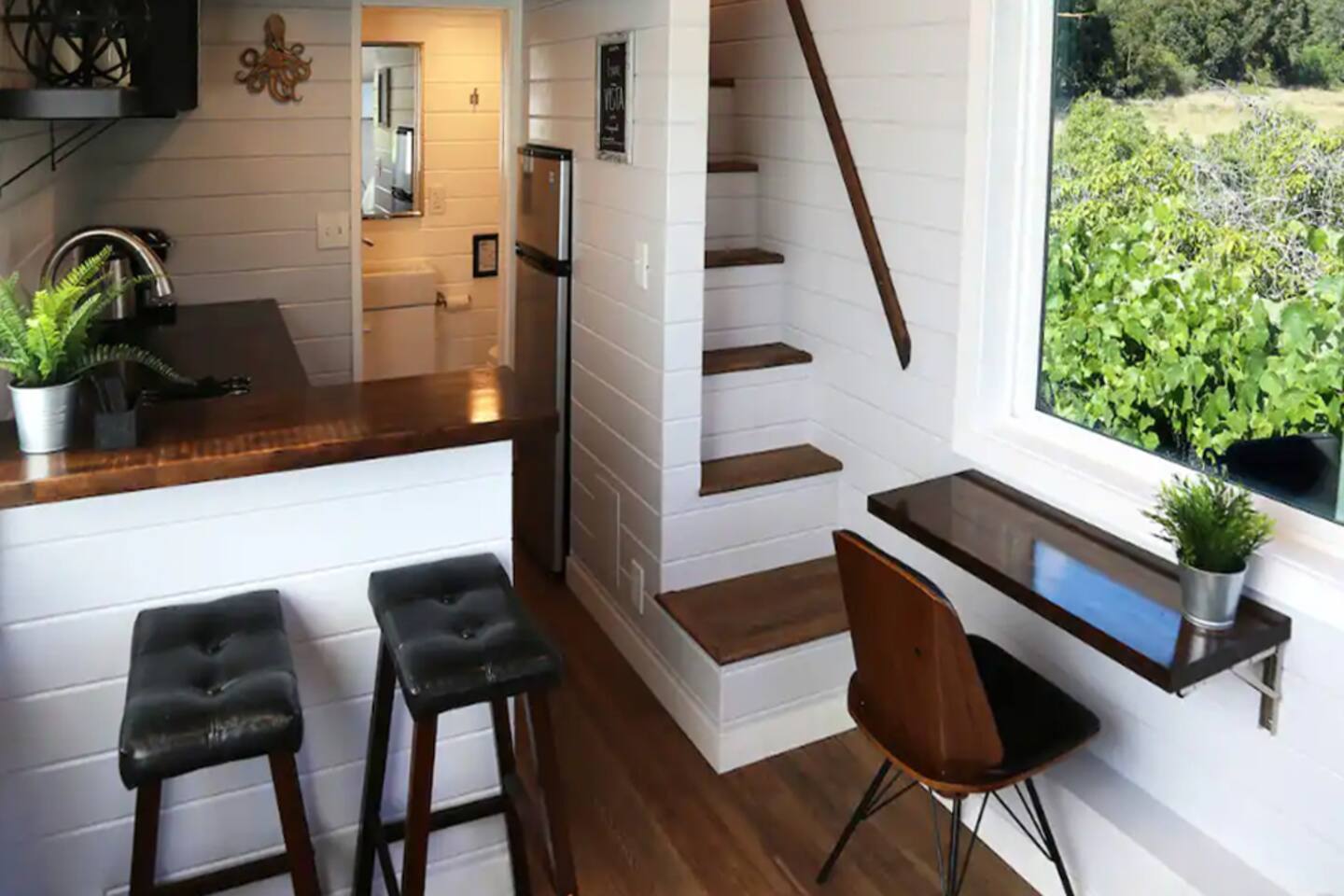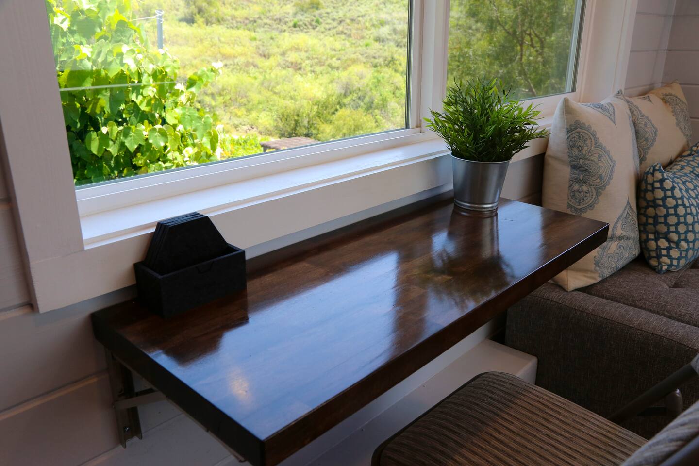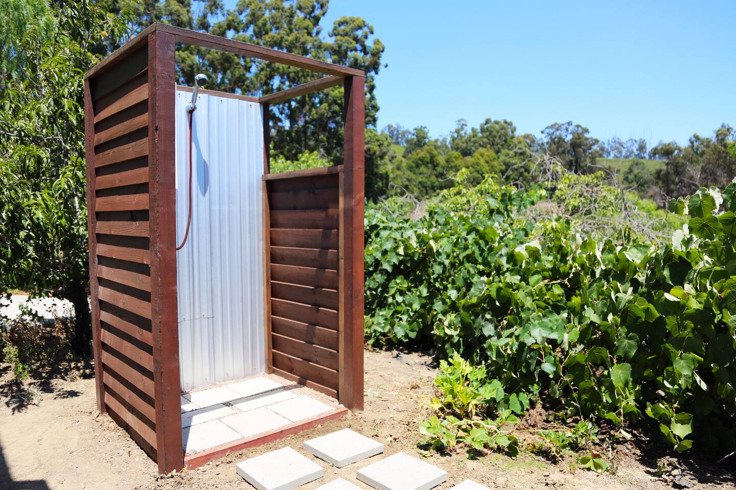 The Vista, "in a tiny experience." Enjoy a relaxing stay in a tranquil location with a nice view above the 200 vine vineyard. Listen to the sounds of birds. Includes a full kitchen, bathroom, queen bed located in the loft (you must go up narrow steep steps,) convection oven/microwave, induction range, air conditioner, heater, desk, indoor and outdoor shower, and quaint patio. Very fast WIFI. The home has both an indoor and outdoor shower.